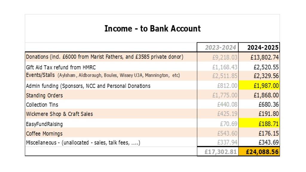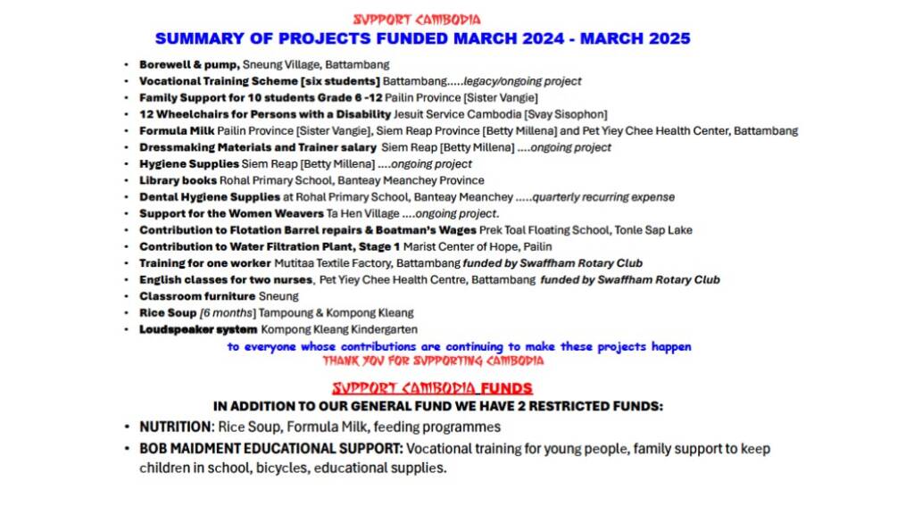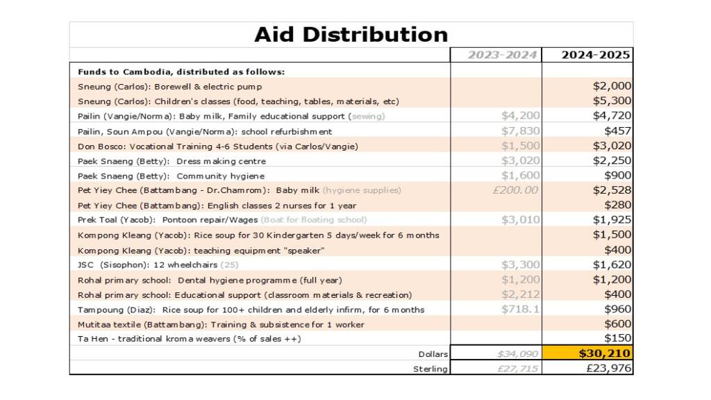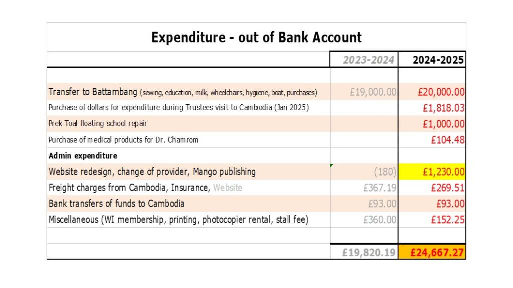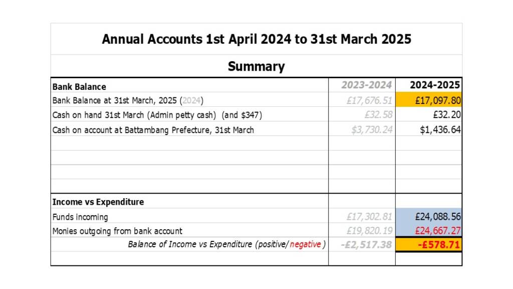 Total income for the year: £24,088.56  Total expenditure (on aid): £23,976 Bank balance as at 31st March 2025: £17,097.80 with a further $1,436.34 in our ‘account’ at the Battambang Prefecture.