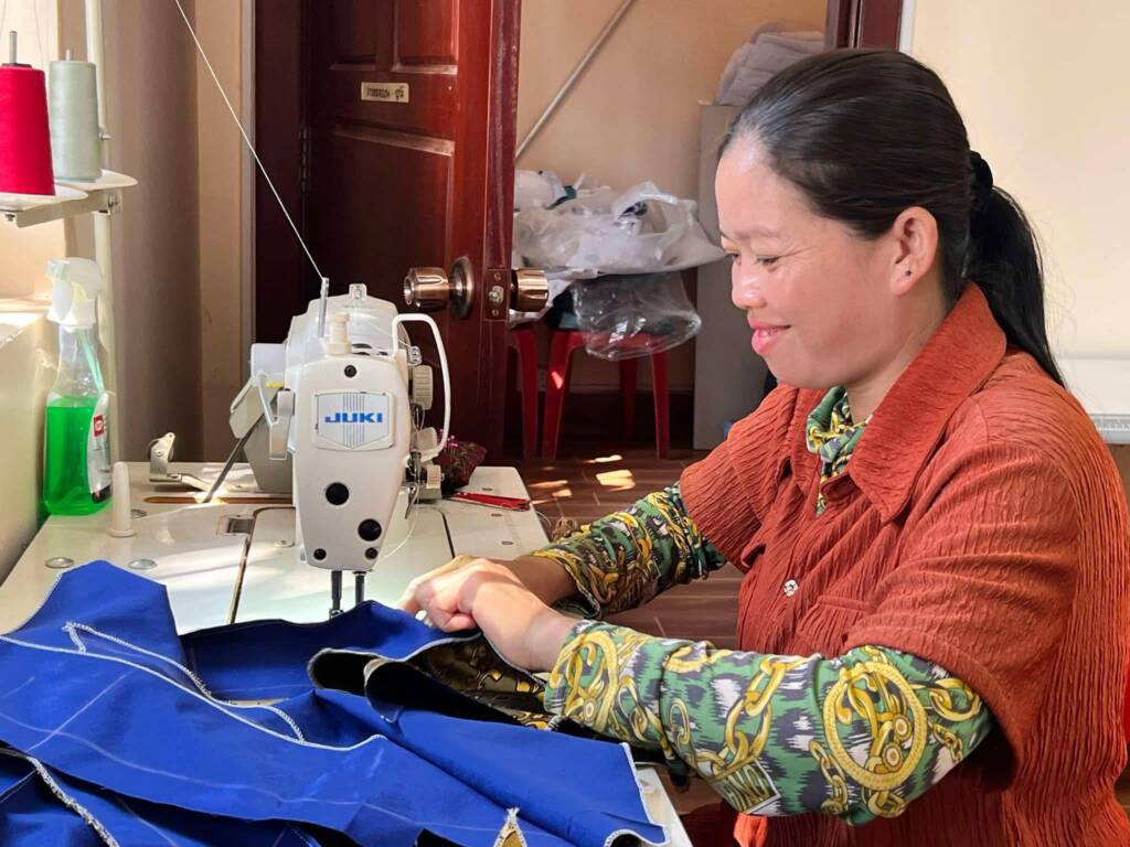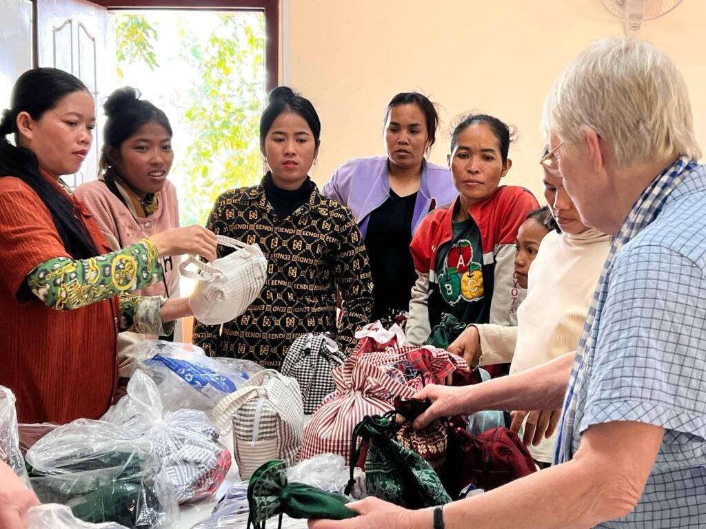 Trustees Maria Brown and Katie Maidment visited the Dressmaking Group in January where they purchased not only the headscarves but also the women’s beautiful handmade bags [also on sale from Support Cambodia] and were able to chat to the women who made them. You can read more about our Trustees’ Visit to Cambodia in January 2025 here.