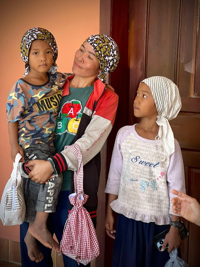 One of the issues faced by many people undergoing chemotherapy is hair loss and the increased need to protect themselves from the sun. The Big C centres offer a choice of headwear for this purpose and now [brilliant news!] that choice also includes the Support Cambodia headscarves designed and handmade by Betty Millena’s Dressmaking Group in Piaksnaeng!!