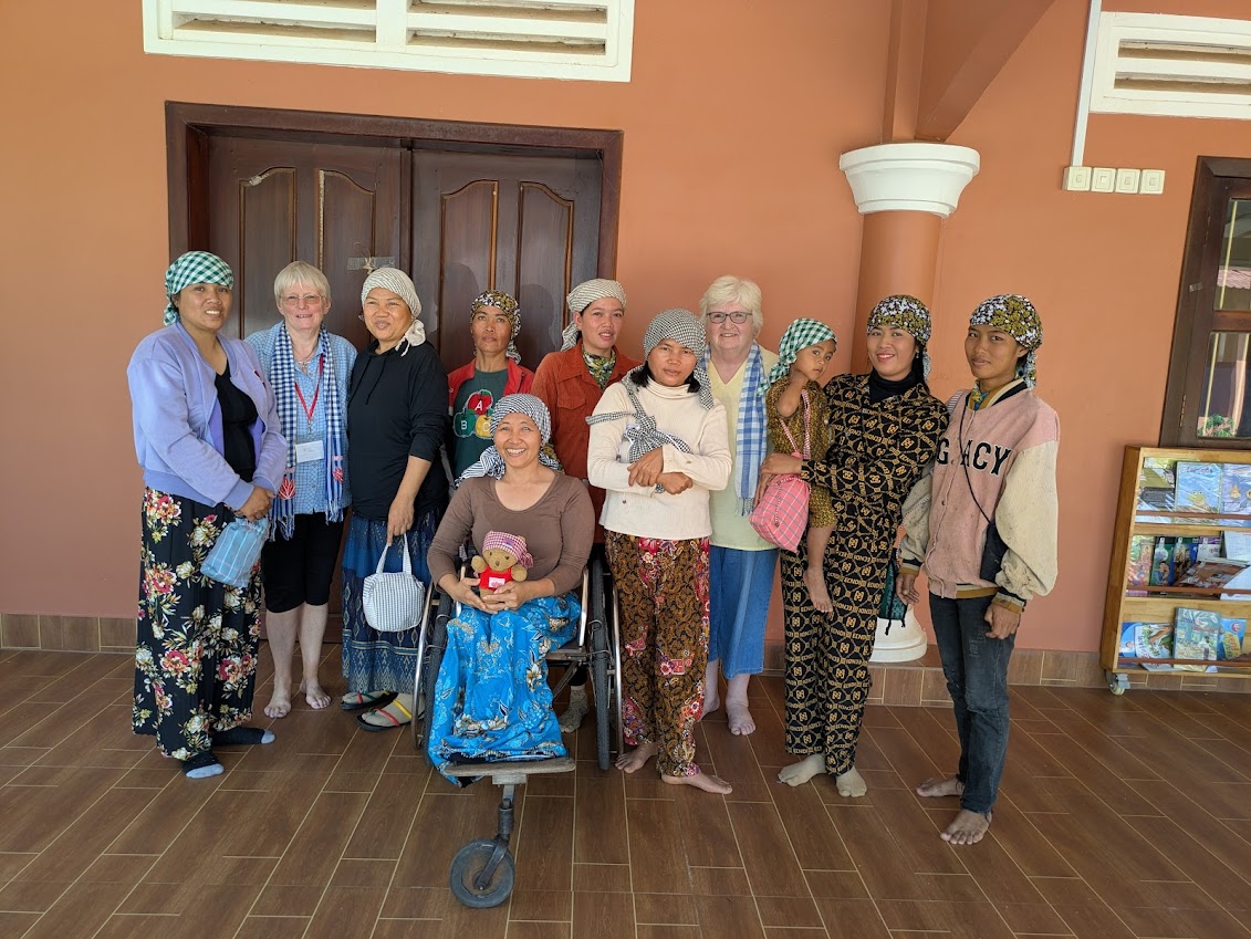 Trustees Maria Brown and Katie Maidment visited the Dressmaking Group in January where they purchased not only the headscarves but also the women’s beautiful handmade bags [also on sale from Support Cambodia] and were able to chat to the women who made them. You can read more about our Trustees’ Visit to Cambodia in January 2025 here.