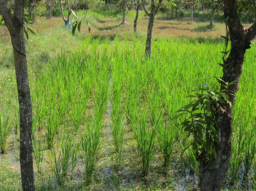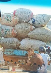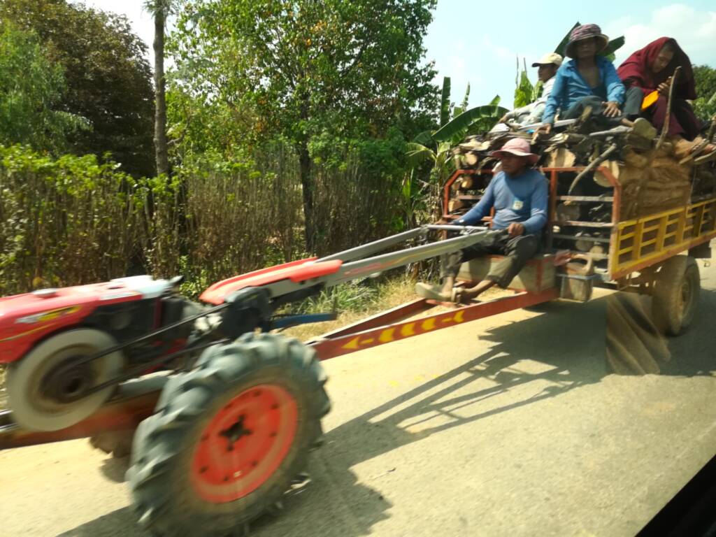 A tuk tuk journey along a dusty, potholed road is quite an experience and good fun.Farm workers sitting on top of great piles of rice sacks stacked onto huge trailers pulled by a motorbike were a common sight. So too were entire families and their pets balanced on a small moped. The roads were lined with stalls selling all manner of goods from farm produce to pots and pans, plants to golden statues and pagodas.