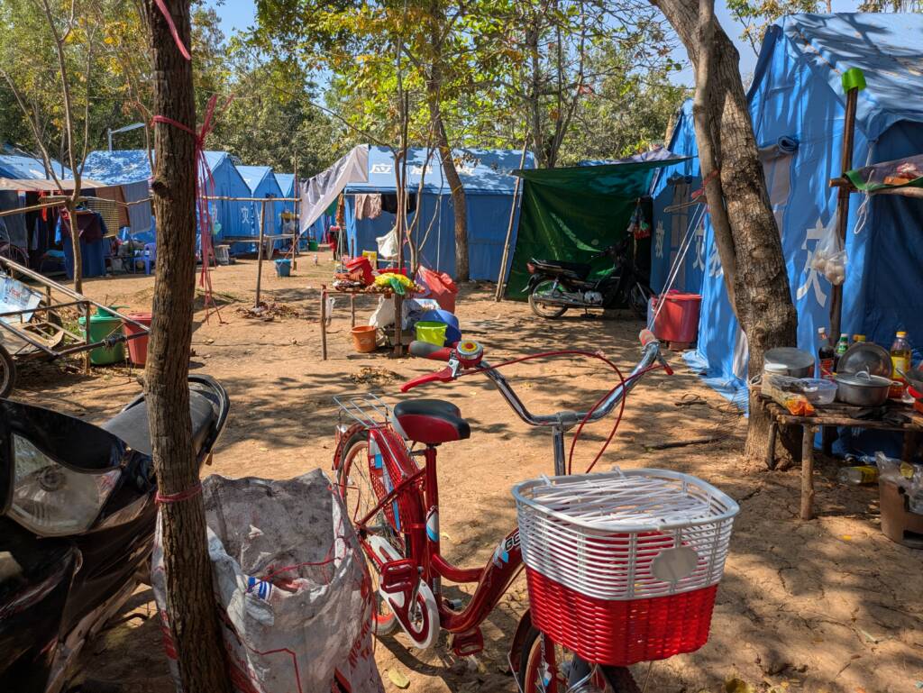 Katie and Rosemary had the opportunity to visit one such evacuee camp about 30k from the Thai border. Over 400 displaced families are living there in the grounds of the local pagoda. Most are housed in tents provided by China. The government has set up makeshift schools on site, staffed by volunteer teachers. The younger children attend these classes in the mornings while their older siblings go to the local secondary and high schools using bikes provided by the government – but we saw quite a few children obviously not doing this!!