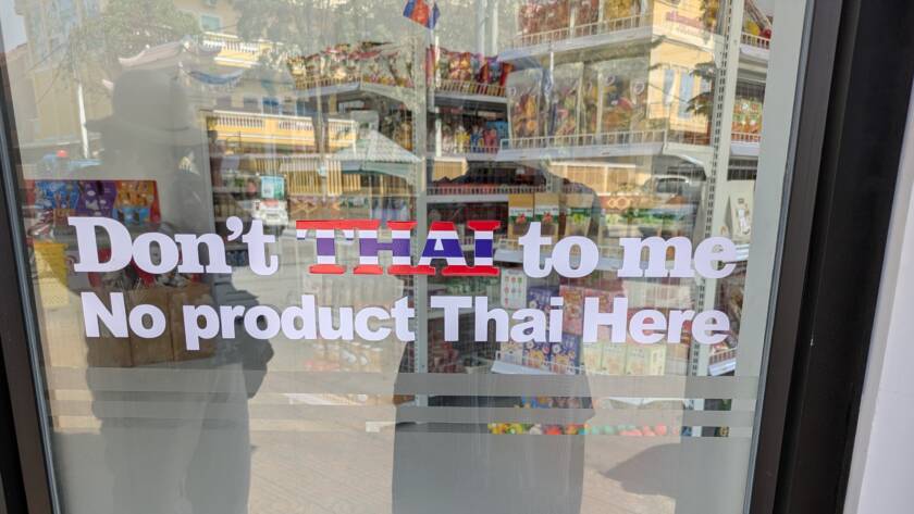 eg: the “No Thai Goods Sold Here” notice on the door of a Battambang supermarket.