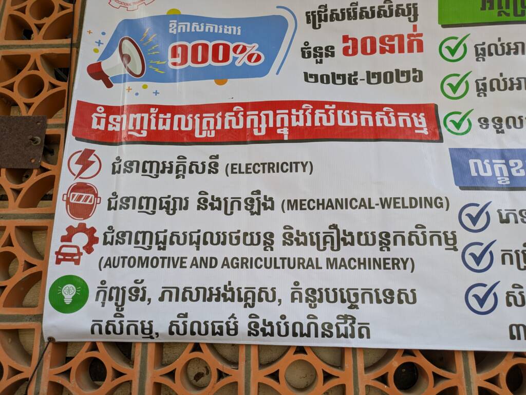 The school is based outside Battambang is a good example. It offers a two year course covering Machinery, Electricity and Welding. In addition, the students study technical English, computer skills, technical drawing, graphics, agricultural planning and morality.