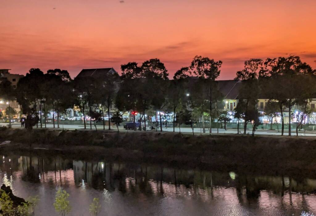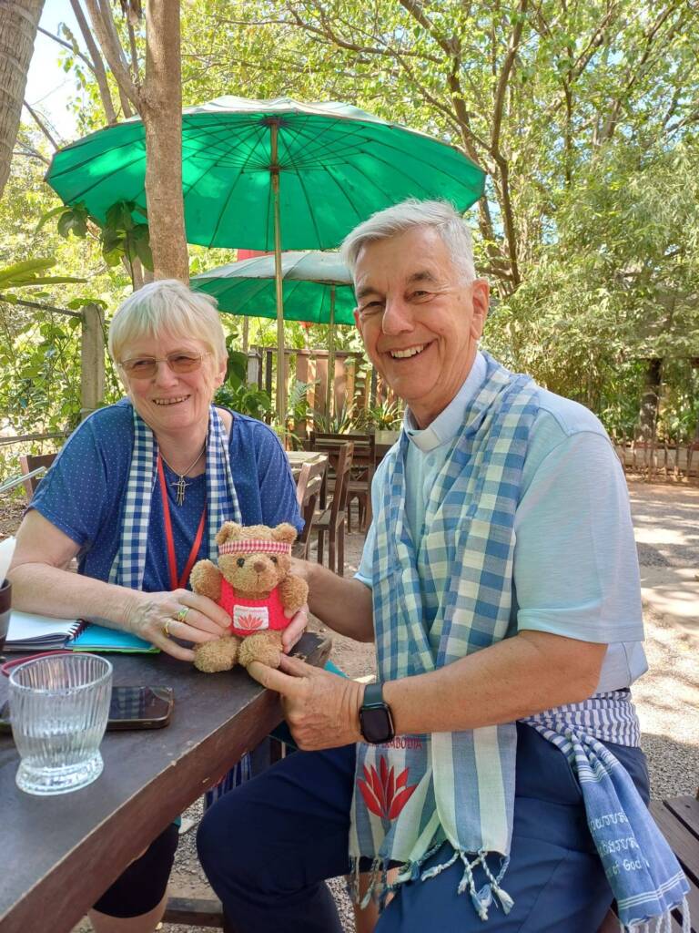 Lunch at the Yeiy Ath Garden Cafe in the Prefecture church compound was followed by an hour-long conversation with Bishop Kike, the Apostolic Prefect of Battambang. As always, an insightful and thought provoking conversation, filled with wise advice and useful information to which we wouldn’t normally have access. An exchange of gifts too: for us, a ‘giraffe’ tote bag ( the giraffe is one of the symbols of the Prefecture) and for the Bishop a ‘Karuna’ bear and our last remaining ‘Support Cambodia’ kroma/scarf with the special red lotus embroidery, normally reserved only for Trustees. Thank you, Father Kike, for your partnership and co-operation over a long, long period of time, without which a significant number of Support Cambodia-funded projects would not have been achieved.