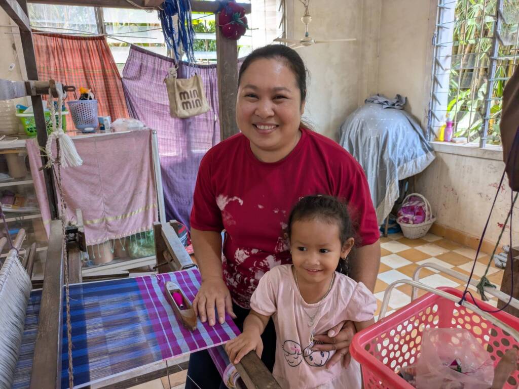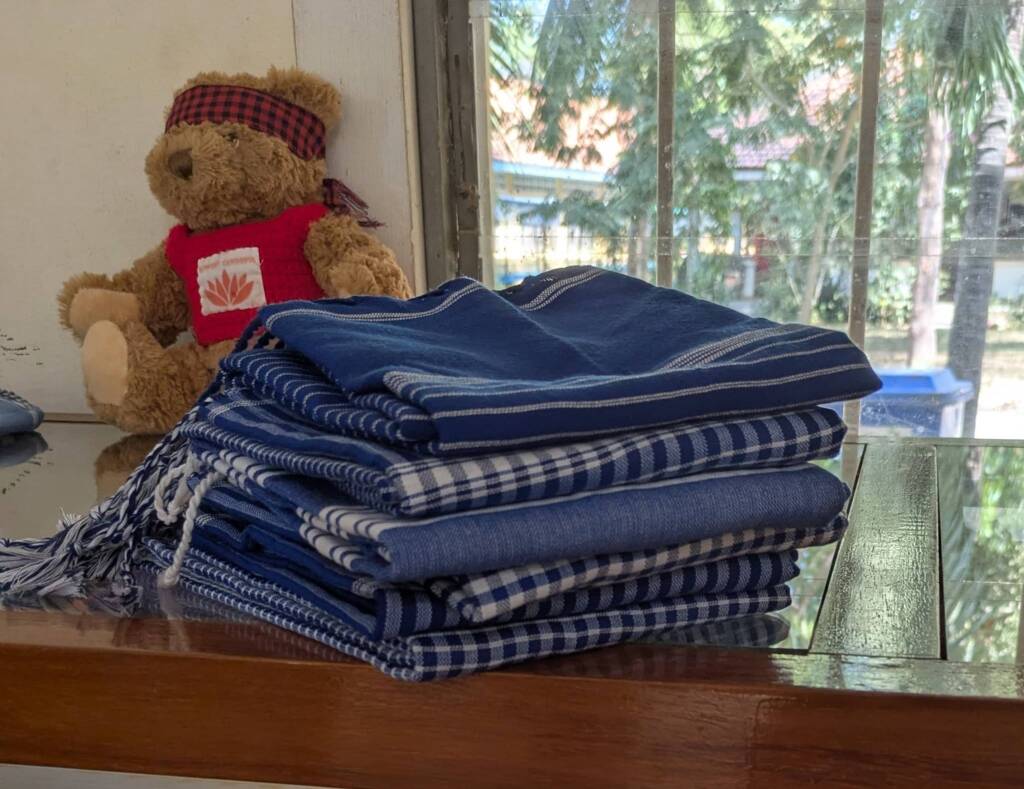 We begin the day with a visit to the Weaving Room at Ta Hen….the women so keen to see us that five of the six offered to come in specially (they don’t work weekends). Although we still have plenty of their unique, hand woven traditional scarves for sale (current selling price just £5.00), we bought some more blue ones, a popular colour in the UK. “We are very grateful you continue to support our work so we can provide for our families”, said supervisor Ms Samnang. We will tell more of Samnang’s story in the weeks to come.